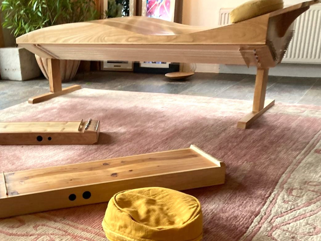 ich vermittle therapeutische Arbeit mit Körpermonochord und Klangliege